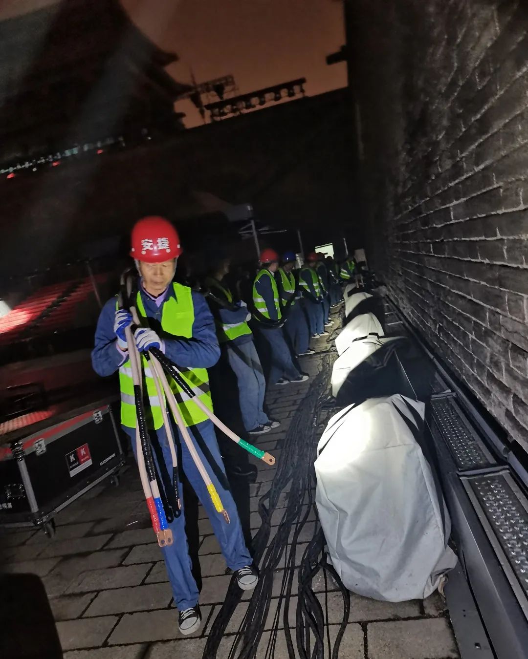接到本次保电任务,z6.com尊龙物联提前周密部署,统筹安排人员,制定完善的保电方案,40余位工作人员连夜铺设电缆,奋战3天,现场调试设备,轮班值守。现场由24人组成的z6.com尊龙物联保电人员分为四小队及后勤保障组,细化分工,各小组人员全程坚守岗位,加强关键环节和点位的监控,随时应对活动现场供电突发情况,确保了此次丝绸之路国际电影节的顺利开幕。