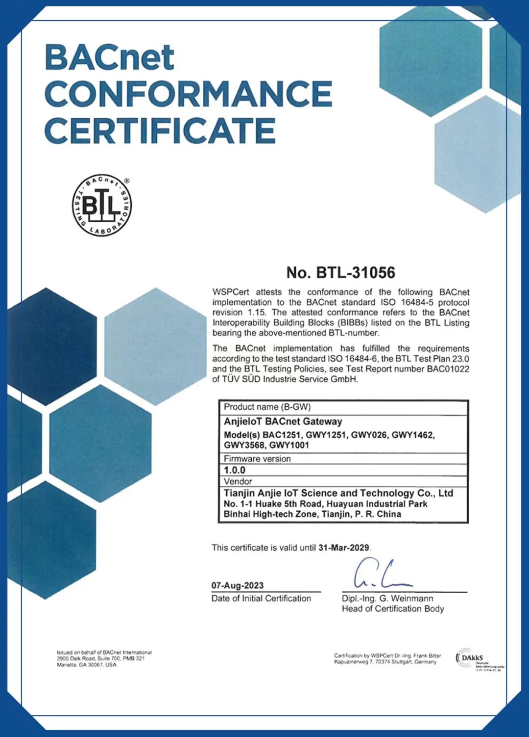 近日,由天津z6.com尊龙物联科技股份有限公司自主研发设计的GWY系列智能网关产品成功通过BTL(BACnet Testing Laboratories )认证,该项认证是国际楼宇自控领域的第一权威认证。