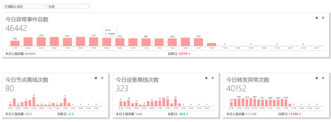 • 云平台实时监控网关和设备的运行状态,分类统计和显示异常情况。