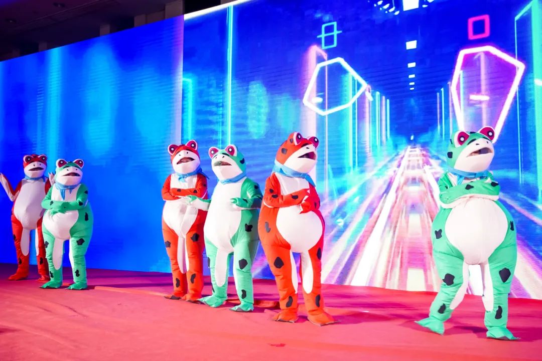 AEO技术部带来的《蛙蛙舞》,一改他们平时与电脑为伴的形象,以可爱、活泼的舞蹈展现了技术团队的另一面,现场笑声不断。